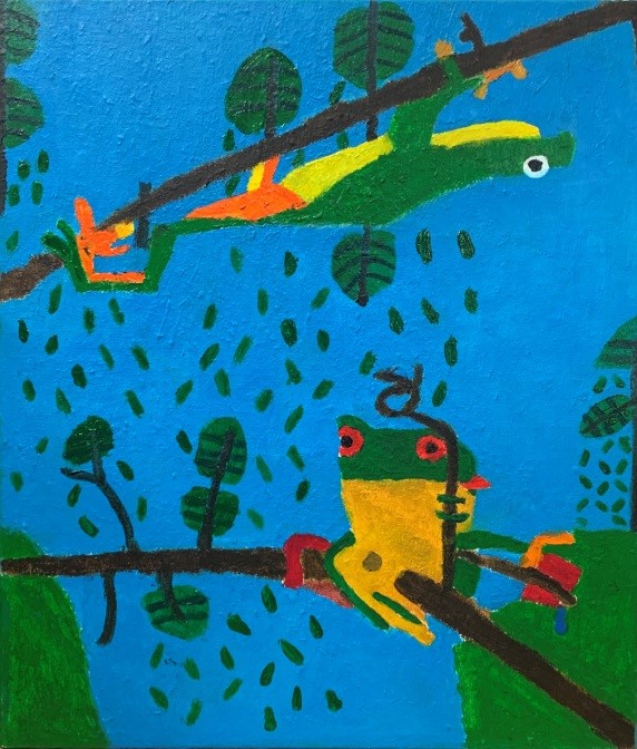 我的同伴去哪了,青蛙不斷的左看右看找不到,原來另一隻青蛙爬上了上面的樹枝也在找著,奇怪我的同伴呢?
